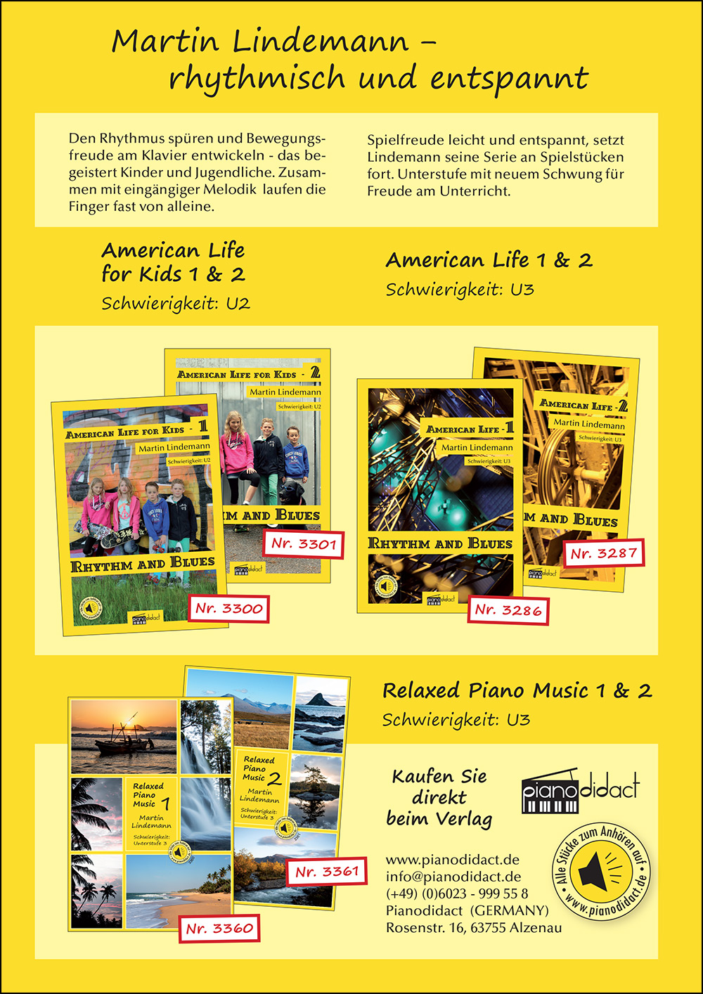 Martin Lindemann (Jahrgang 1962) studierte Mitte der 80er Jahre am Hamburger Konservatorium klassische Klaviermusik. Schon während seines Studiums beschäftigte er sich viel mit Popular Musik und spielte in verschiedenen Top 40 Bands als Keyboarder, Pianist, Gitarrist und Bassist. Seit den 90er Jahren widmete er sich der Komposition und veröffentlichte einige Klavier CDs , die er auf Konzerten vorstellte. Mittlerweile ist er in Hamburg ein angesehener Pädagoge für Klavier und arbeitet gerne mit Kindern und Jugendlichen. Sein Motto für die didaktisch gut durchdachten Stücke aus "American Life 1 und 2" lautet: "Was gut klingt, muss nicht unbedingt schwer sein." Martin Lindemann lebt am Rande von Hamburg und hat vier Kinder.