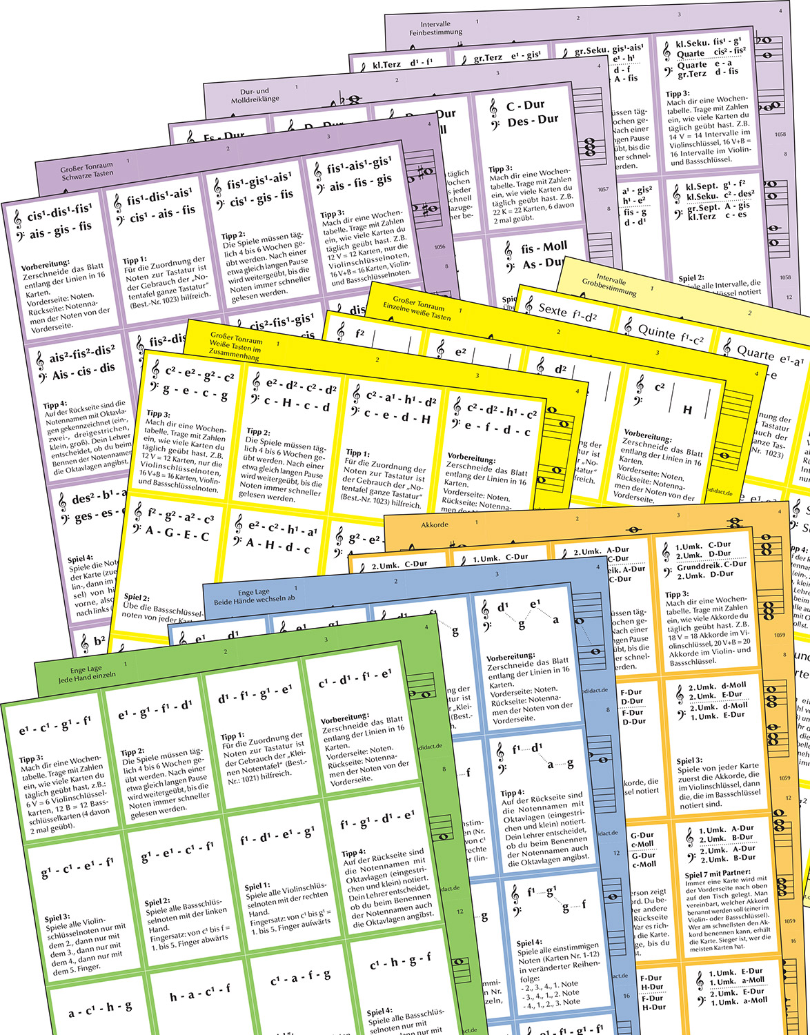 Die Farben der Notenkarten kennzeichnen die Zugehörigkeit zu den entsprechenden Tastenminibänden. Die Notenkarten sind aber auch eine gute Ergänzung für jedes andere Lehrwerk.