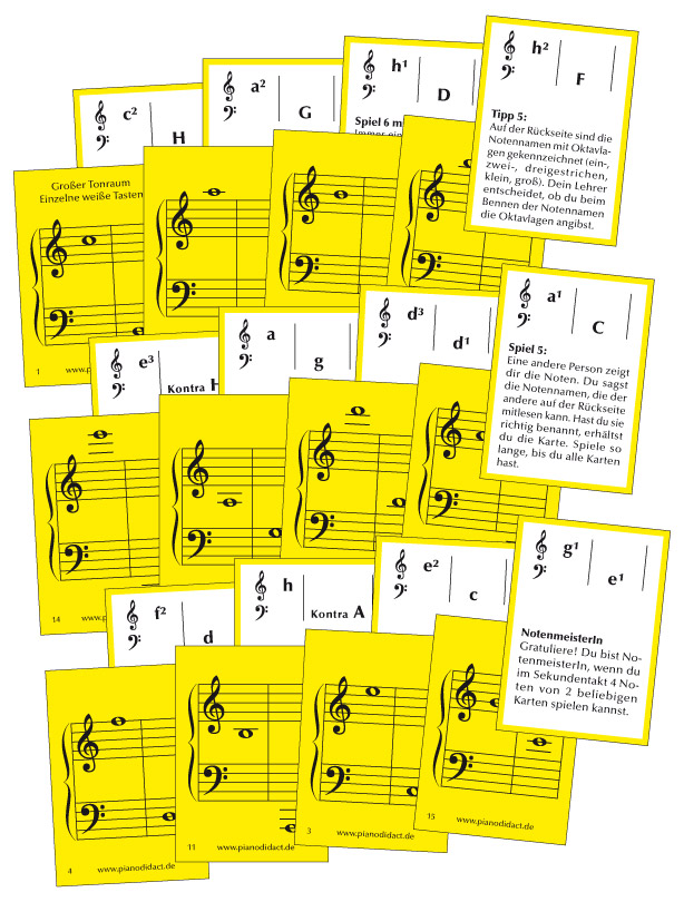 Notenkarten gehören zur Grundausstattung für jeden Klavierspieler. Bei dem günstigen Preis kann sie sich jeder für zu Hause leisten. „Five minutes a day“ heißt das Motto für das tägliche Üben. Ob alleine, mit Eltern oder Geschwistern oder im Unterricht mit dem Lehrer - die Spiele mit den Notenkarten sind abwechslungsreich und machen Freude.
